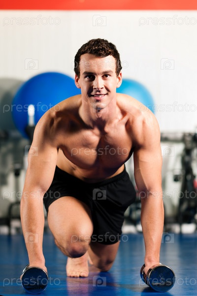 Мужчина делает отжимания с гантелями