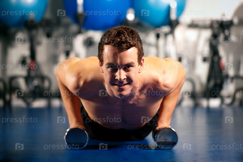 Мужчина делает отжимания с гантелями