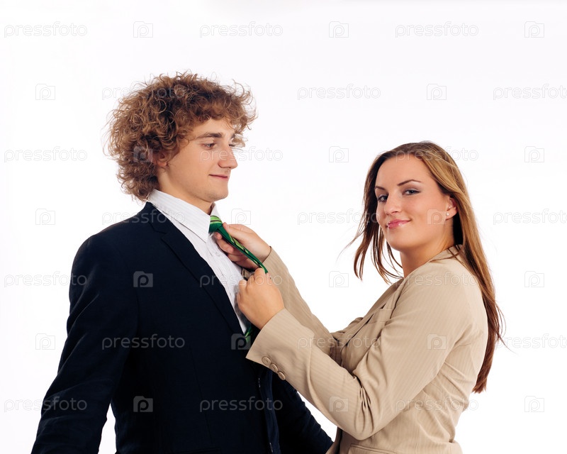 Молодая деловая женщина поправляет галстук мужчине