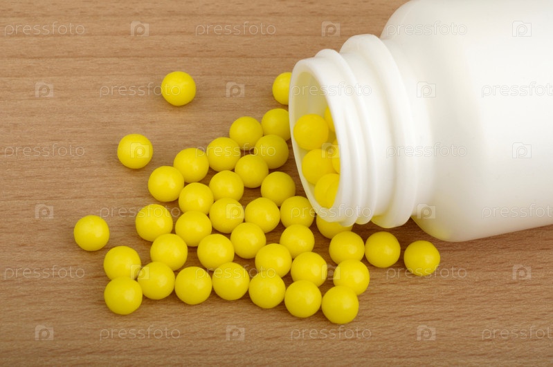 Желтые драже аскорбиновой кислоты высыпались из бутылька на стол