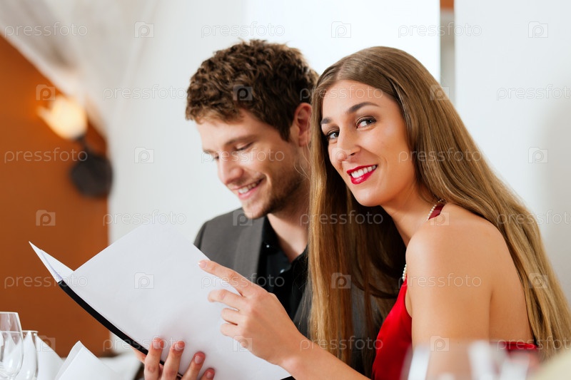 Молодая пара смотрят меню в ресторане