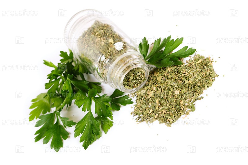 Опрокинутая баночка с сушеной петрушкой и свежая зелень петрушки на белом фоне