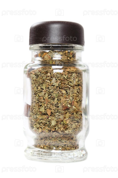 Стеклянная банка с базиликом на белом фоне