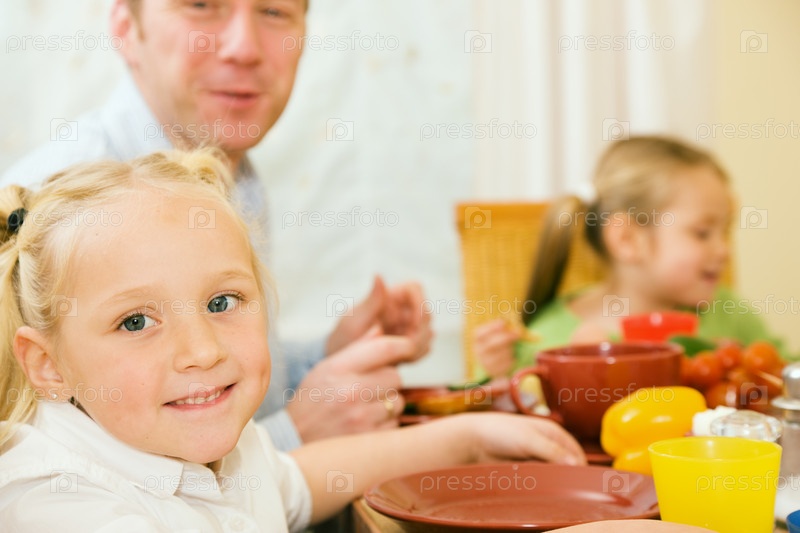 Отец и дочери завтракают дома