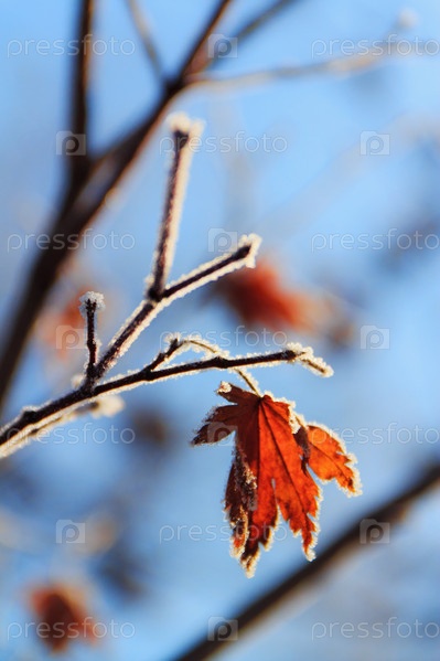 Иней на засохшем листочке клена