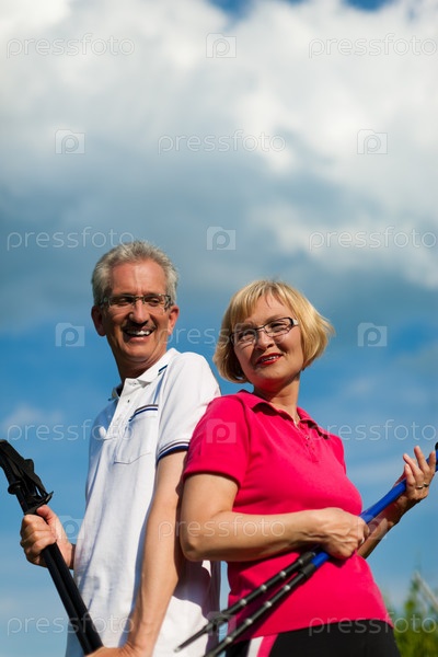 Пожилая пара с палками для скандинавской ходьбы на фоне пасмурного неба