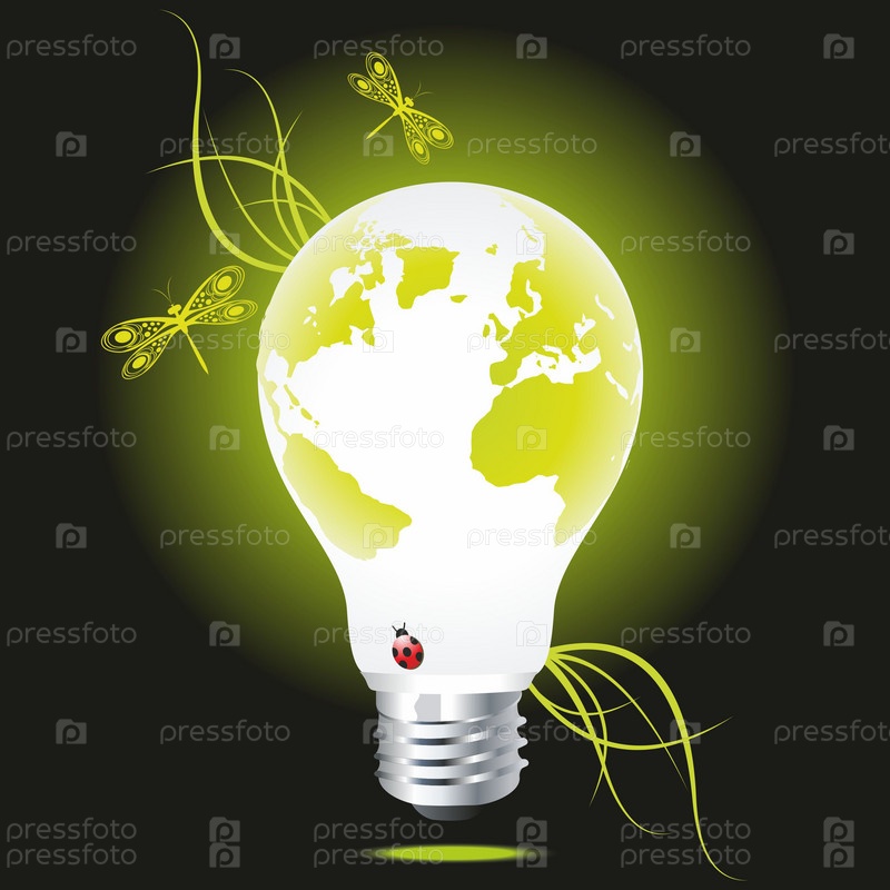 Лампочка как зеленый глобус с травой и стрекозами на черном фоне, экологический символ