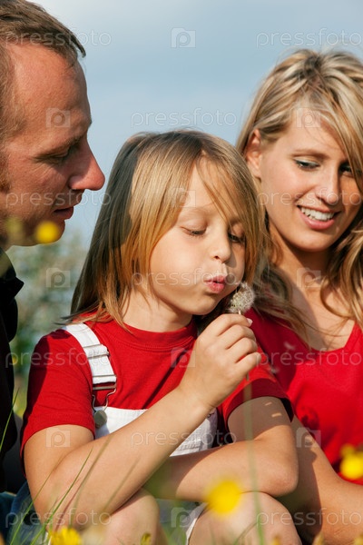 Счастливая семья из трех человек сидят на поляне и дуют на одуванчики