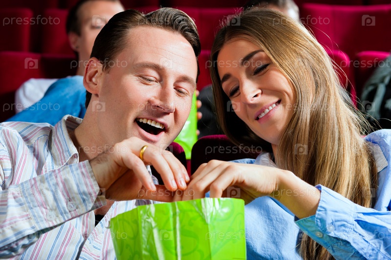 Девушка в кинозале передает пакет мужчине