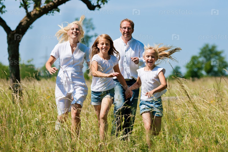 Молодая семья бежит по летнему лугу