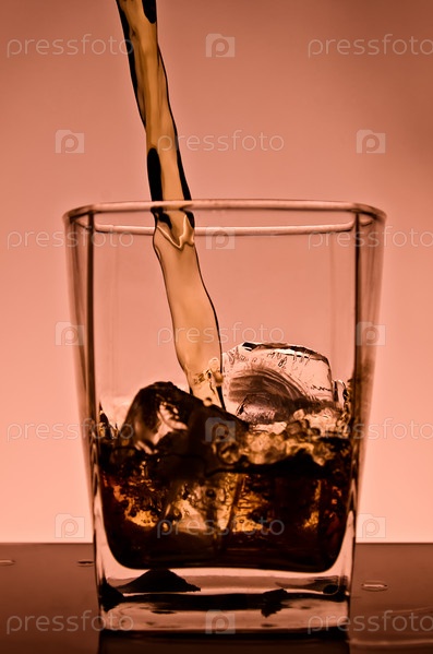 Виски наливается в бокал с кубиками льда