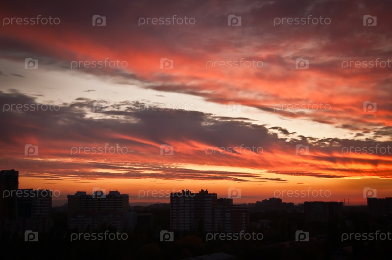 Красное небо на закате над городом