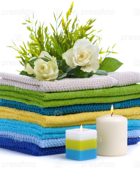 Стопка полотенец, белые розы и горящие свечи на белом фоне
