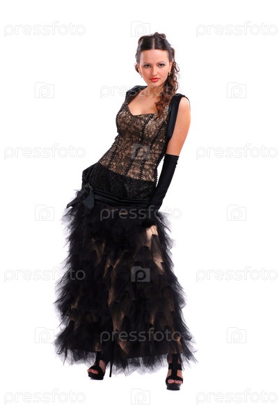 Красивая молодая девушка в черном платье на белом фоне