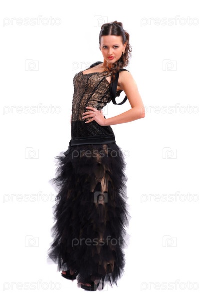 Красивая девушка в черном платье на белом фоне