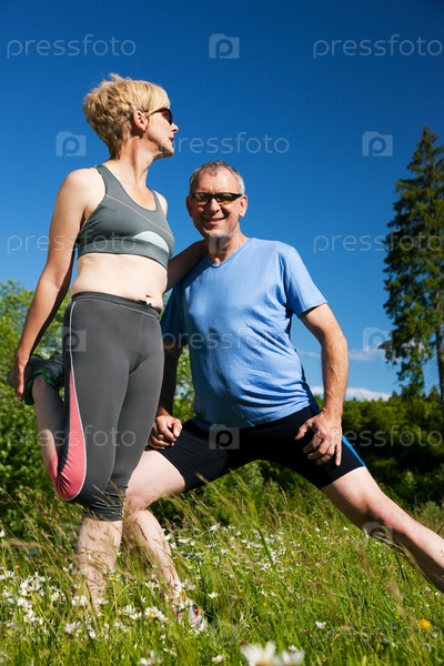 Семейная пара делает упражнение на улице