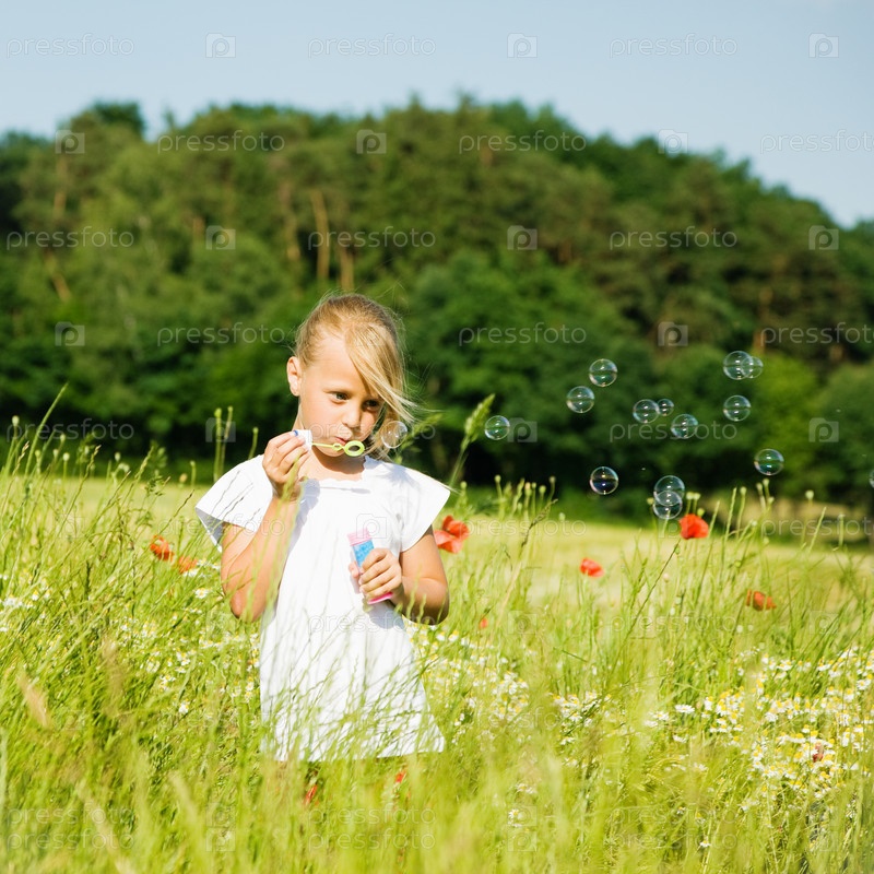 Девочка пускает мыльные пузыри в поле