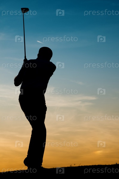 Силуэт мужчины с клюшкой для гольфа на закате дня