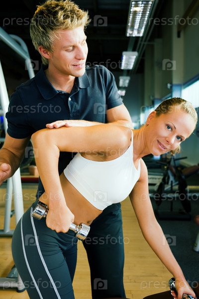 Инструктор показывает девушке как правильно работать с гантелями