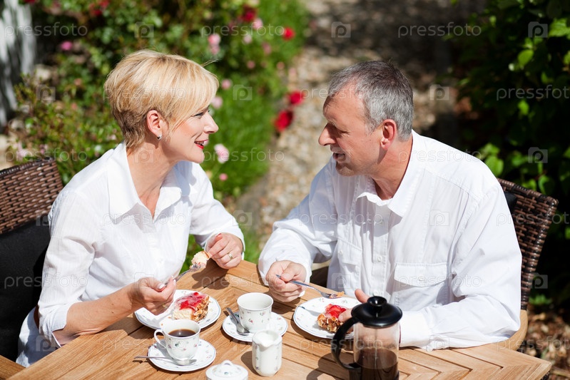 Семейная пара за столиком в саду