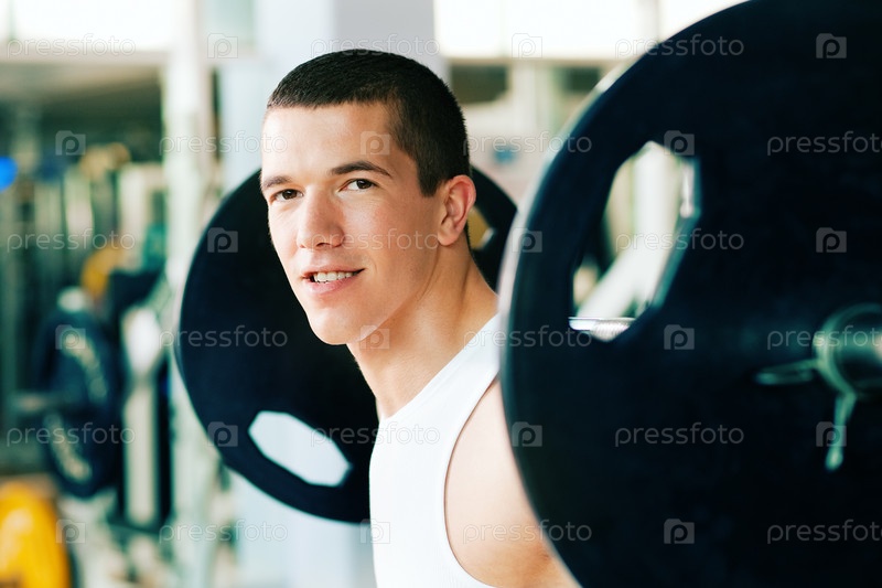 Молодой человек поднимает штангу