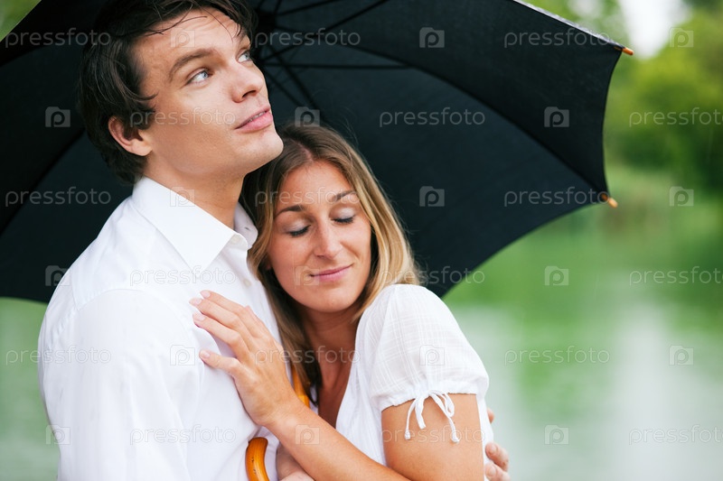 Счастливая пара стоит под зонтиком под дождем