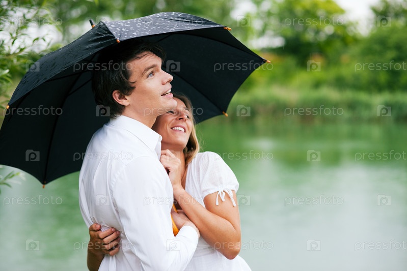 Молодая пара стоит под зонтом на улице