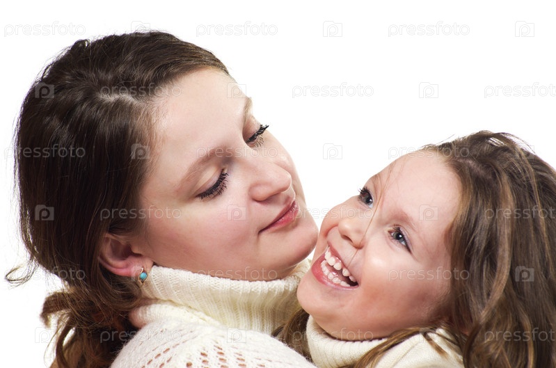 Красивая маленькая девочка и ее мать на белом фоне