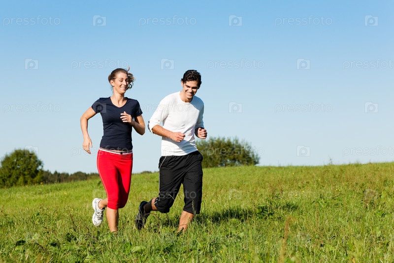 Молодой человек и девушка бегут по полю