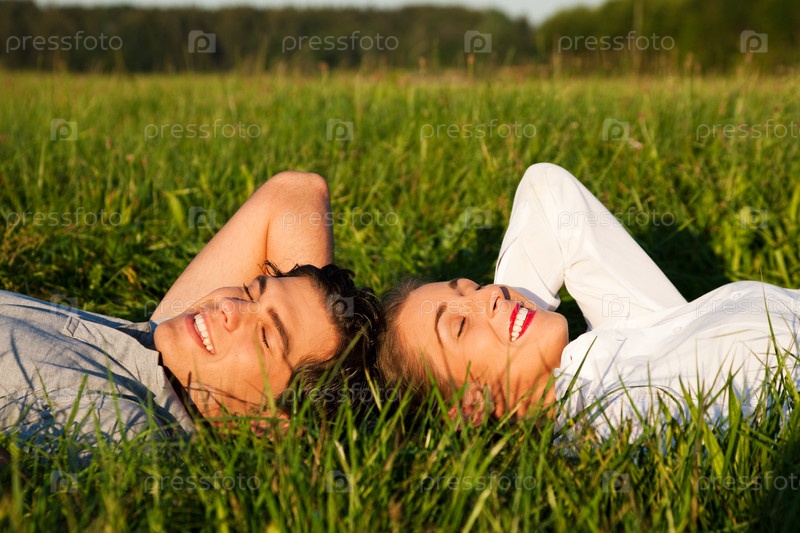 Молодой человек и девушка лежат на траве