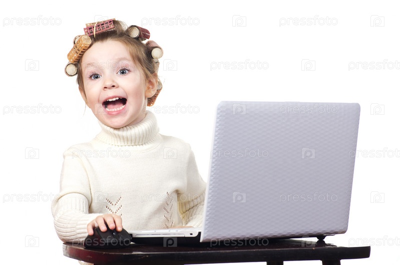 Восторженная девочка с бигуди на волосах сидит за ноутбуком
