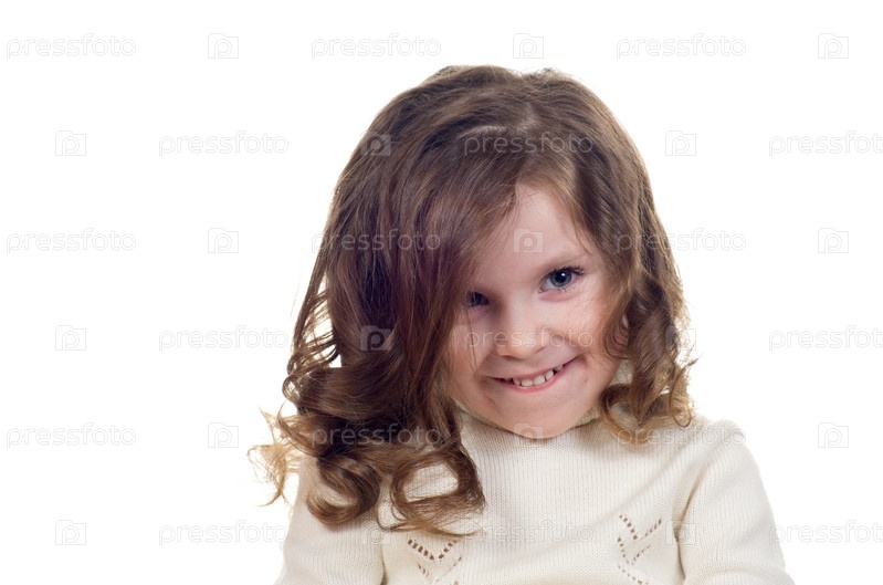 Кудрявая девочка хитро улыбается на белом фоне