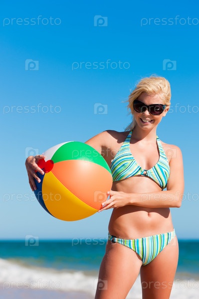 Блондинка на пляже с надувным мячом