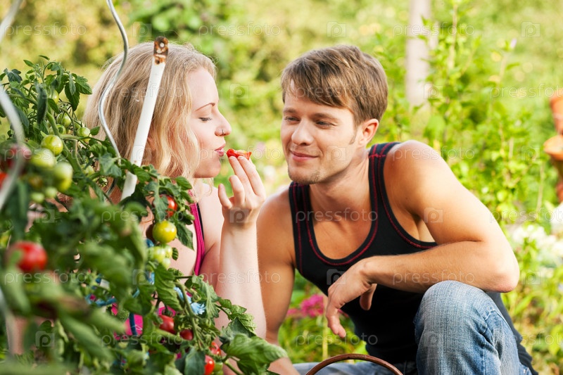 Мужчина в саду смотрит как его девушка есть помидоры