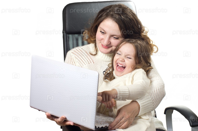 Мать и дочь смеются, сидя в кресле за компьютером. Изоляция на белом фоне