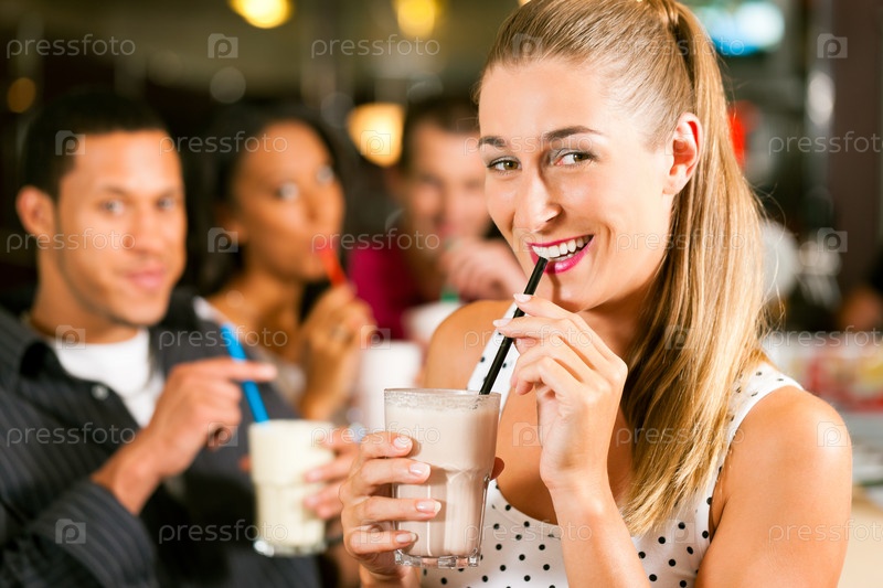 Девушка пьет молочный коктейль