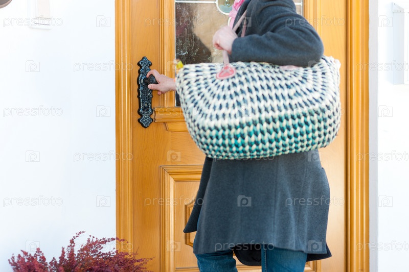 Женщина с сумкой открывает входную дверь