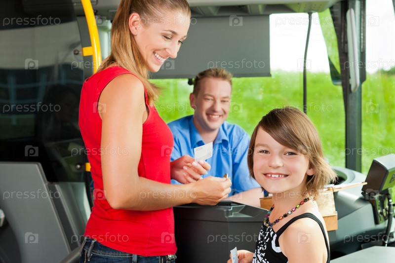Женщина с девочкой, покупающие билет в салоне автобуса