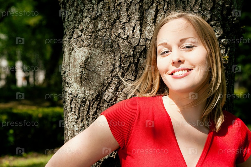Молодая красивая женщина на свежем воздухе у дерева