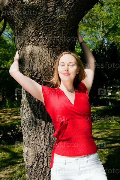 Молодая красивая женщина на свежем воздухе у дерева