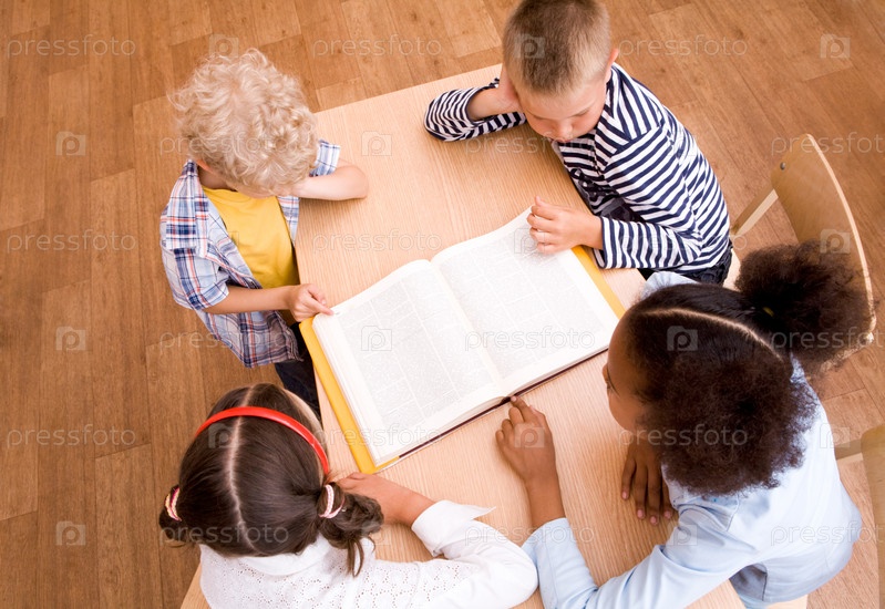 Выше вид учеников, смотрящих страницу энциклопедии на уроке чтения