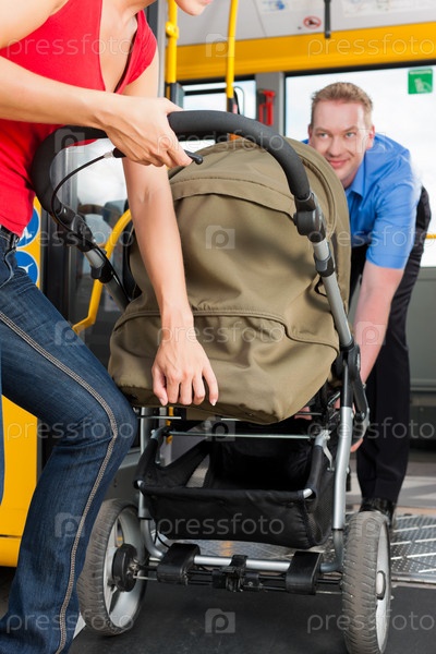 Девушка с коляской заходит в автобус при помощи водителя