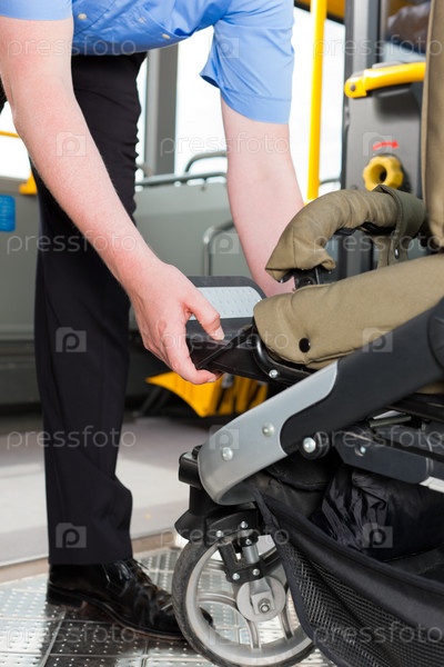 Водитель помогает занести коляску в автобус
