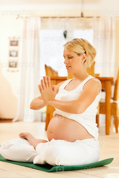 Беременная женщина занимается йогой