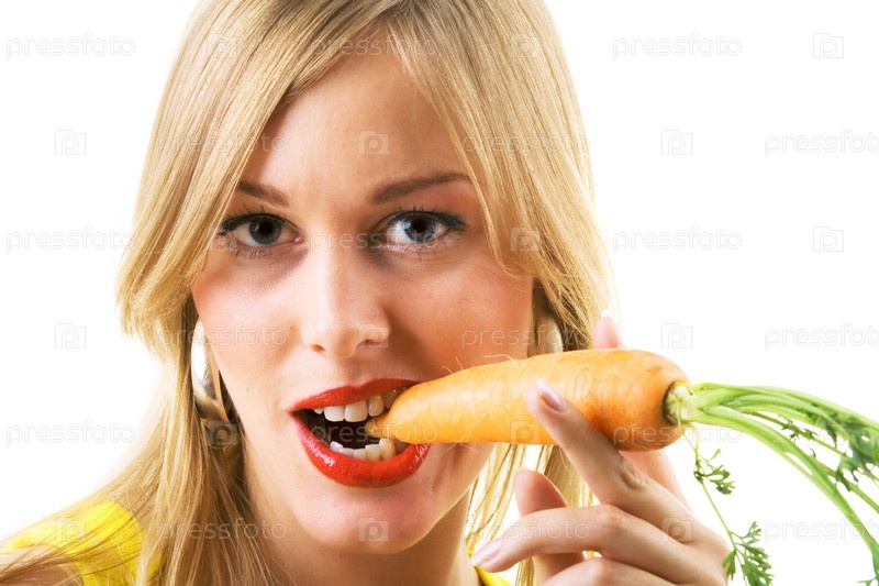 Девушка на белом фоне с морковкой