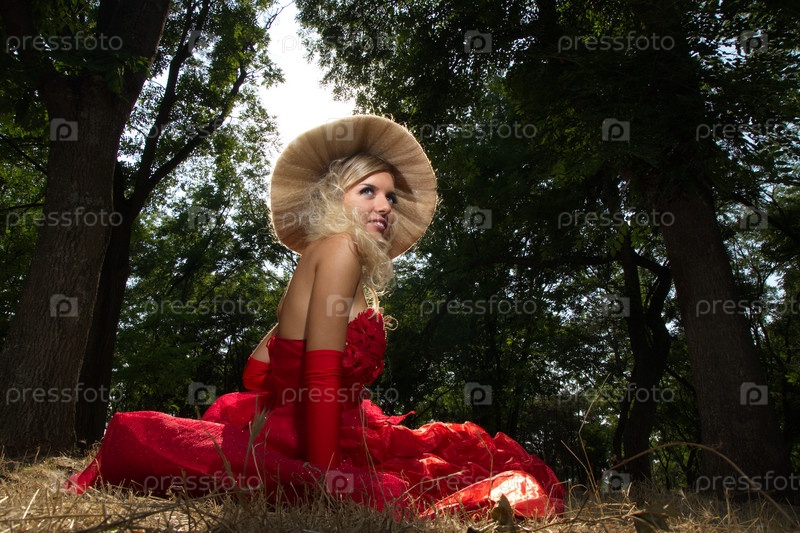 Девушка в красном вечернем платье и шляпе в летнем лесу