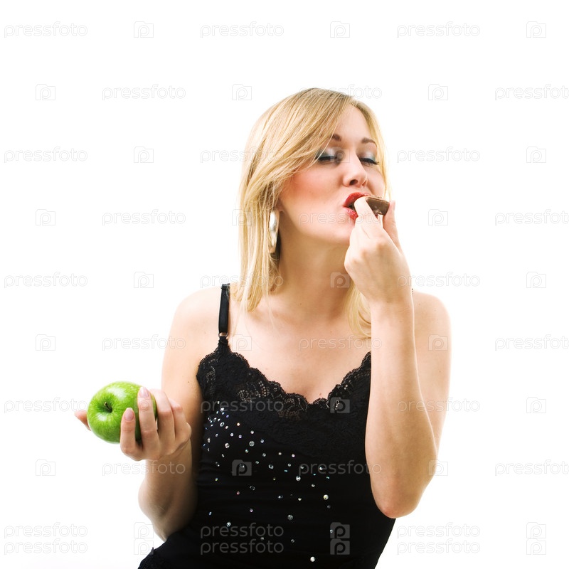 Девушка на белом фоне с яблоком в руках ест шоколад