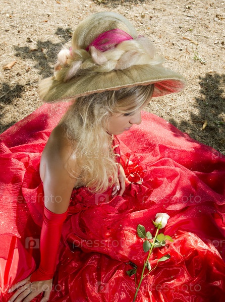 Девушка в красном вечернем платье и шляпе сидит на земле с белой розой