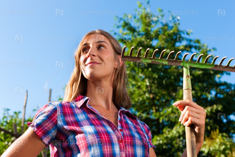Красивая девушка держит грабли
