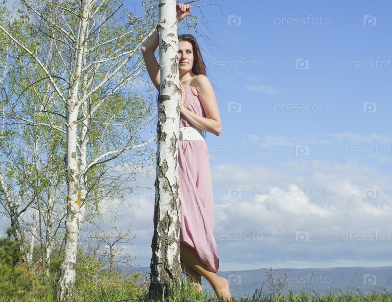 Стройная девушка в розовом платье в весеннем лесу